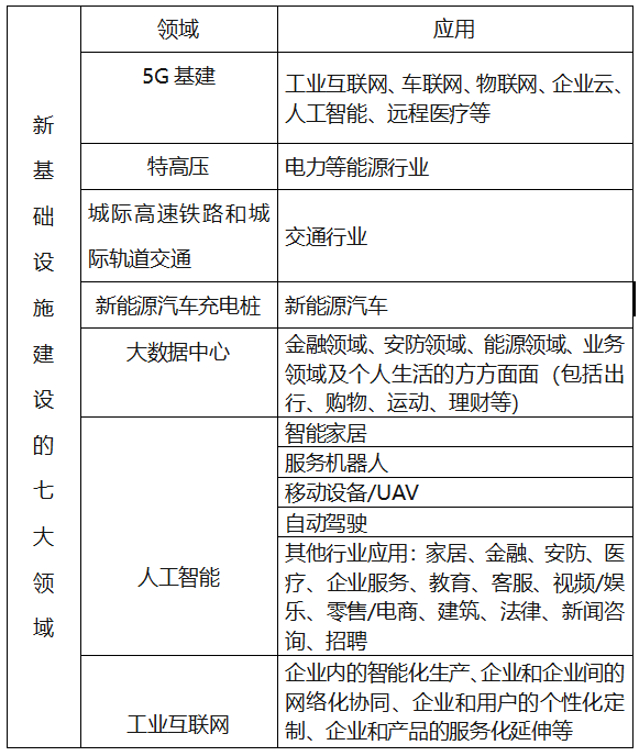 不過,關(guān)于新型基礎設施建設的具體范圍,在中央相關(guān)文件中并沒有給出十分明確的定義,但在中央電視臺中文國際頻道的定義中,新型基礎設施建設是指發(fā)力于科技端的基礎設施建設,主要包含5G基建、特高壓、城際高速鐵路和城際軌道交通、新能源汽車充電樁、大數(shù)據(jù)中心、人工智能、工業(yè)互聯(lián)網(wǎng)等七大領(lǐng)域,涉及到通信、電力、交通、數(shù)字等多個社會民生重點行業(yè)。相對來說,中央電視臺對“新型基礎設施建設”的范圍定義更加廣泛;到目前為止,這一定義也獲得了更大的社會認同度。